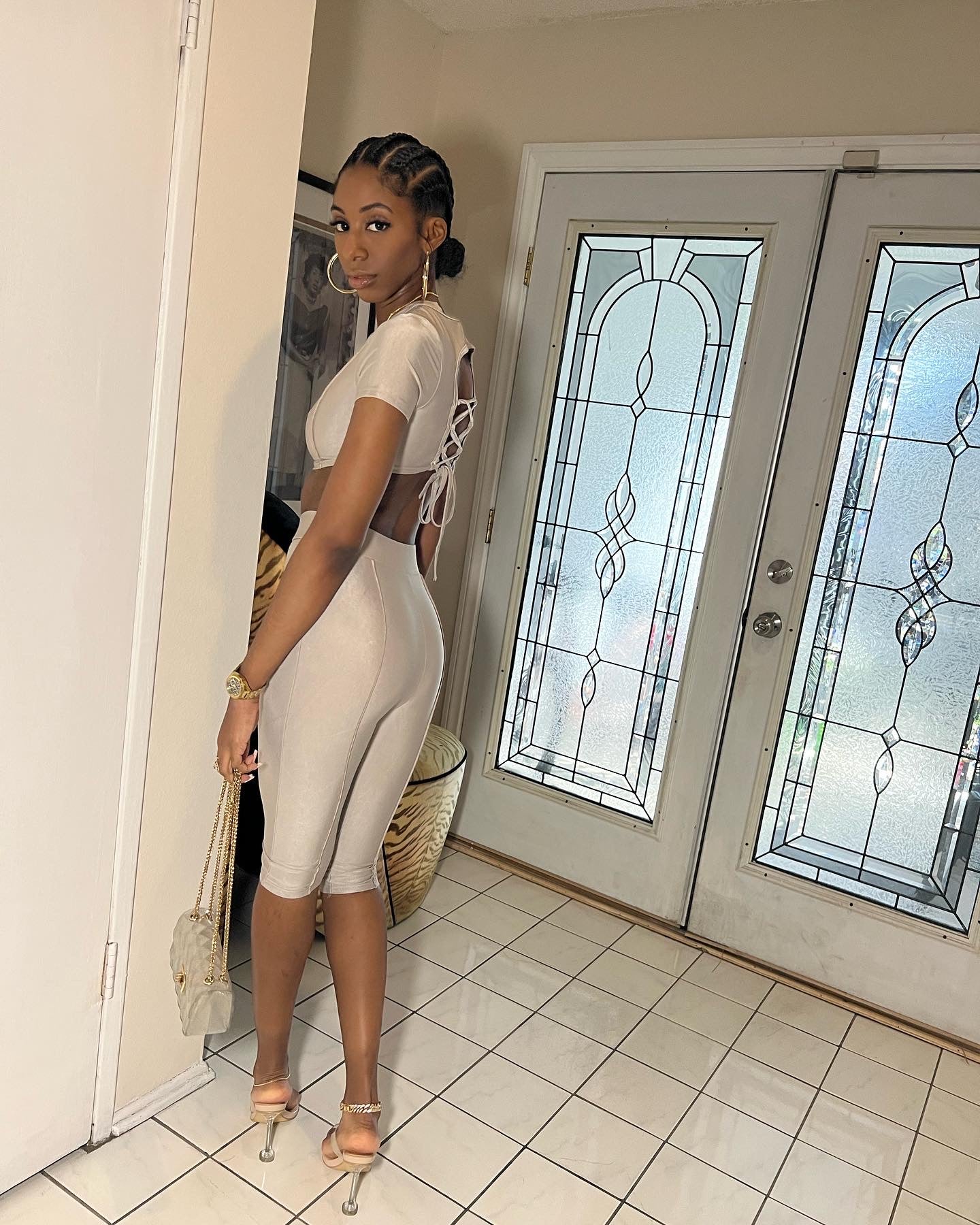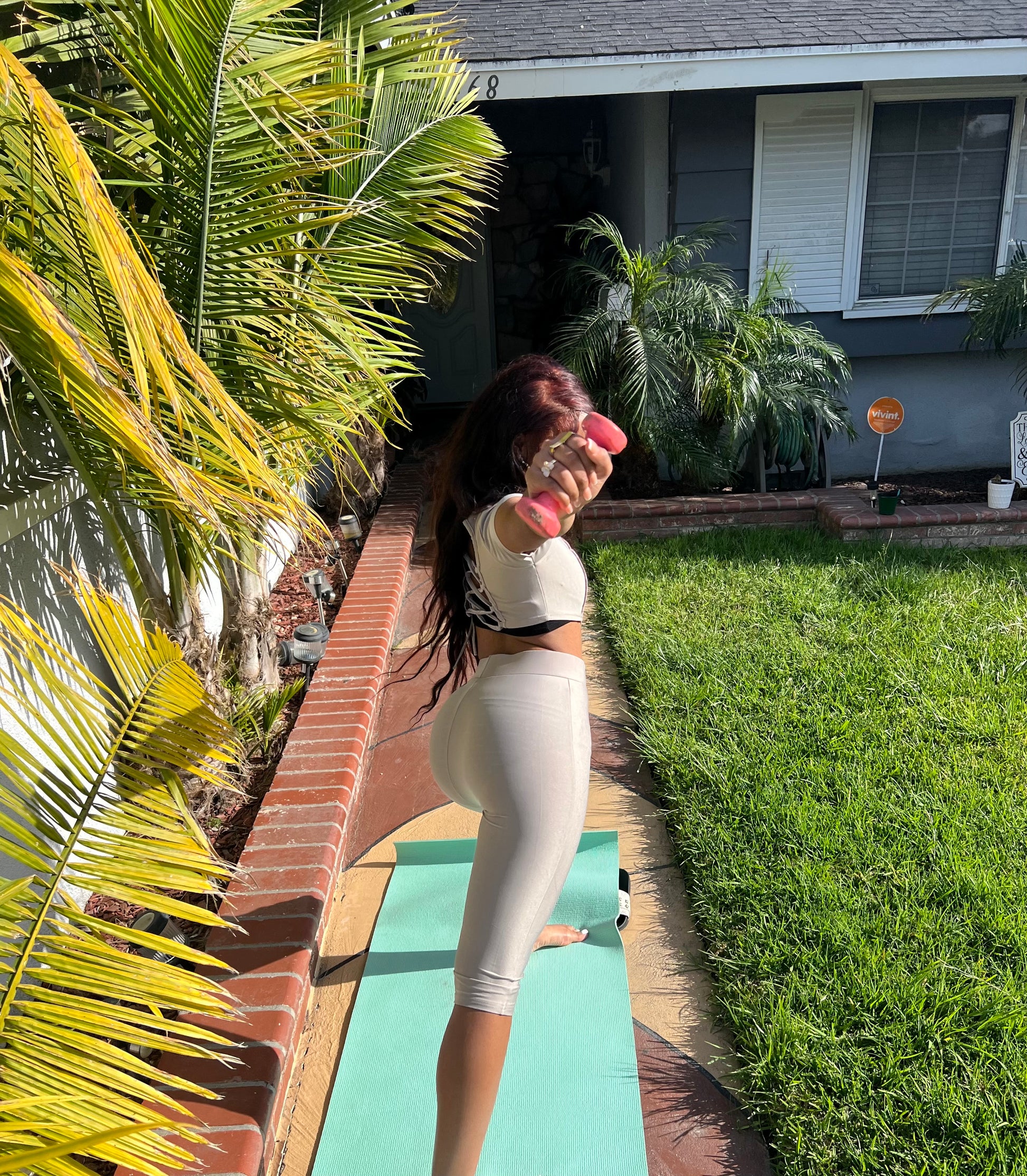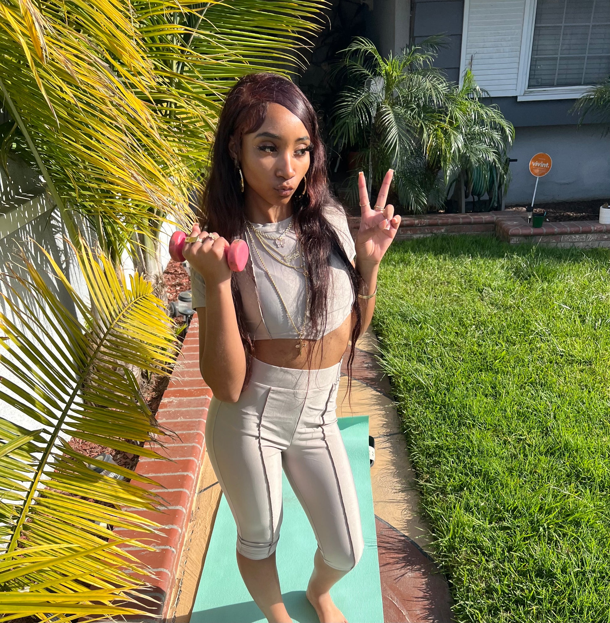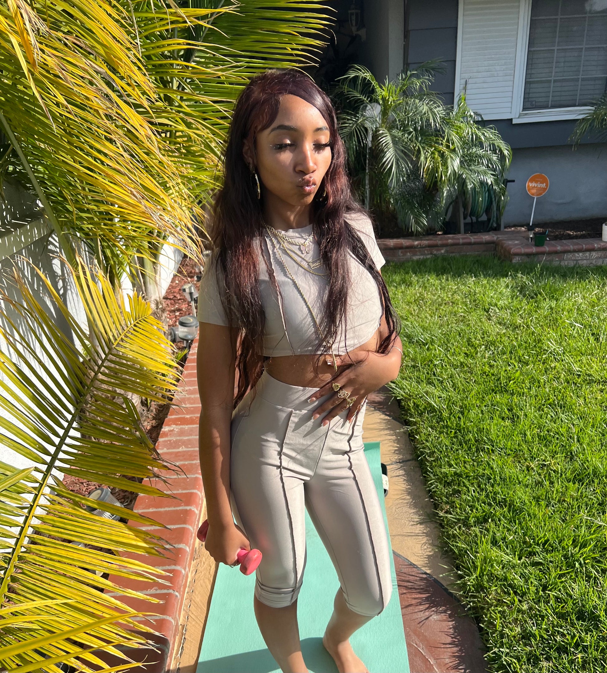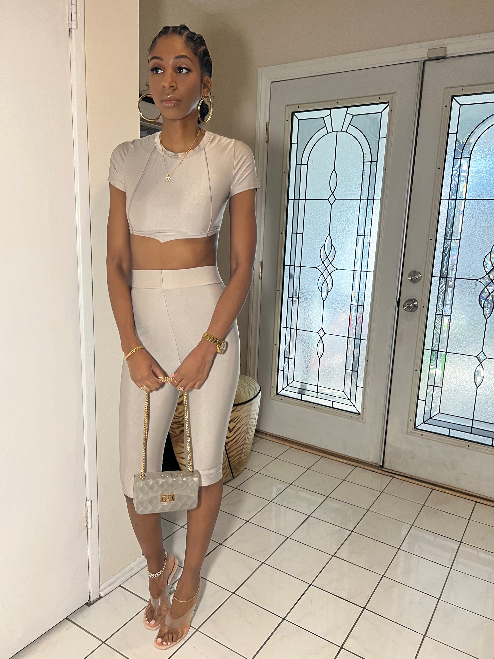 Brown spandex set with cropped tie back top, and peddle pusher bottoms.