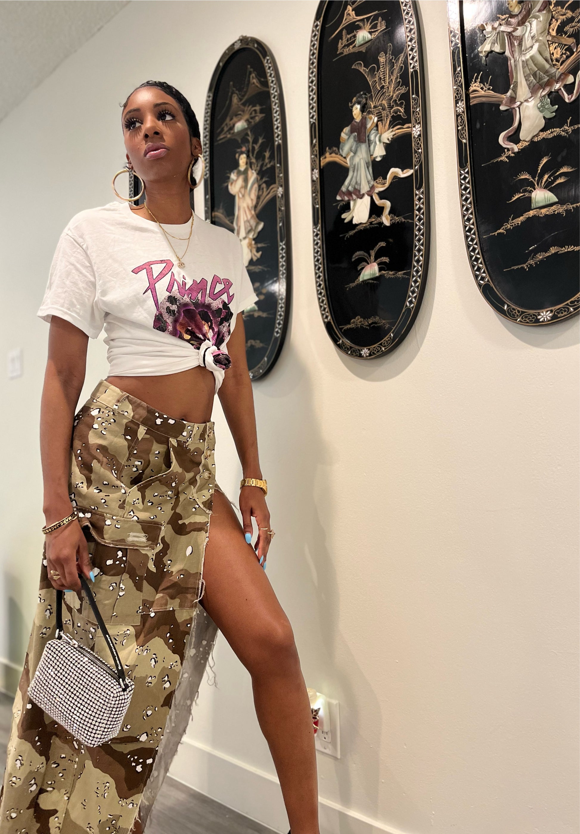 Brown black and white army fatigue print, long Jean skirt, with buttons on the side and high split.